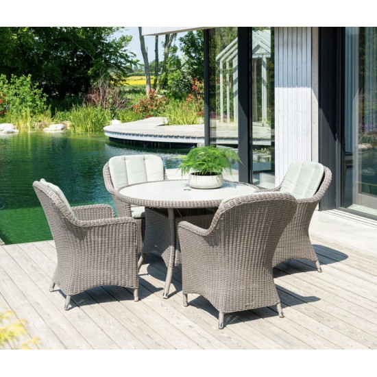 Hazelmere Round Table 1.15m — это красиво оформленный круглый обеденный стол для улицы. В набор входит 1 стол Hazelmere с размерами 115 см ширина × 115 см глубина × 74 см высота, вес около 17 кг. Предназначен примерно для 4 человек, с керамическим стеклом на столешнице и прочным плетёным корпусом. Гарантия: 3 года.