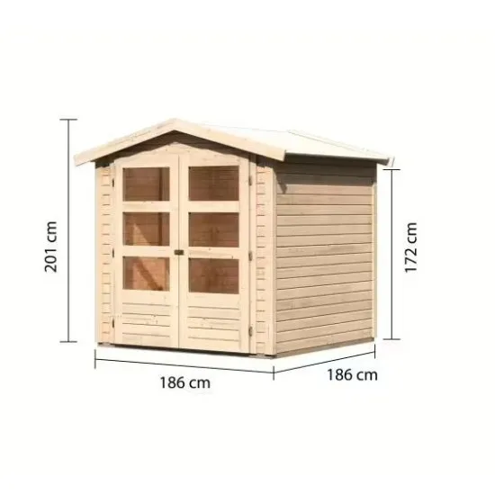 Двускатная крыша площадью 4,2 м² придает дому традиционный характер, а компактные размеры (внутренние размеры 178 х 178 см) делают его идеальным местом для отдыха, хобби или хранения вещей. Двойные двери со стеклянными панелями пропускают естественный свет, создавая светлую и уютную атмосферу. Дополнительно дом оборудован надежным замком для защиты от несанкционированного доступа.