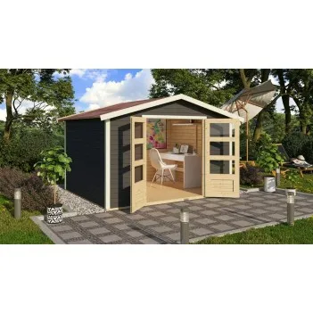 Двускатная крыша площадью 9,1 м² придает ей вневременной вид, а доступность коричнево-серого или натурального цвета позволяет индивидуально адаптировать ее к вкусу и потребностям пользователя. Просторные двустворчатые двери с остеклением пропускают много дневного света, обеспечивая светлый и приятный интерьер. Дом оборудован дополнительной безопасностью в виде предохранительного люка, повышающего защиту от несанкционированного доступа.