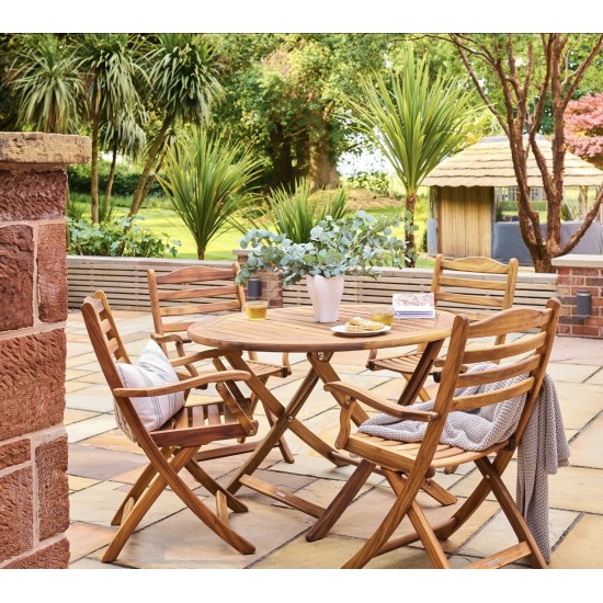 Складное кресло Redcliffe Acacia Wood Folding Carver With Arms сочетает классический стиль и практичность. Изготовлено из прочного массива акации с богатой золотистой окраской, которая подчёркивает естественную структуру древесины и добавляет тепла любой открытой зоне. Поверхность кресла тщательно отшлифована вручную и покрыта маслом для защиты от атмосферных воздействий и придания блеска. Подлокотники создают дополнительный комфорт при сидении, а механизм складывания позволяет легко транспортировать или хранить изделие, когда оно не используется. Благодаря весу около 6,5 кг кресло удобно переносить и хранить; его размеры составляют 570 × 610 × 910 мм. В комплект входит 1 × Redcliffe Acacia Wood Folding Carver With Arms. 3-летняя гарантия подтверждает надёжность и долговечность изделия.