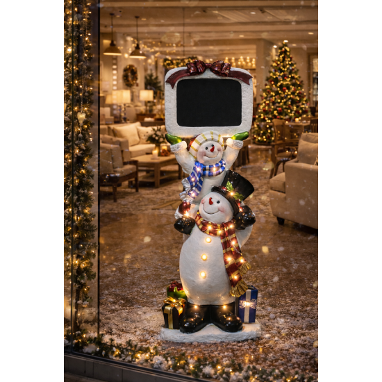 Snowmen Blackboard (26 LEDS) является частью коллекции декоративных фигур снеговиков, изготовленных из прочной стеклопластиковой смолы и металлических элементов для профессиональных праздничных инсталляций.