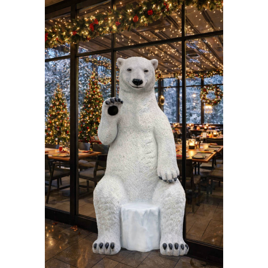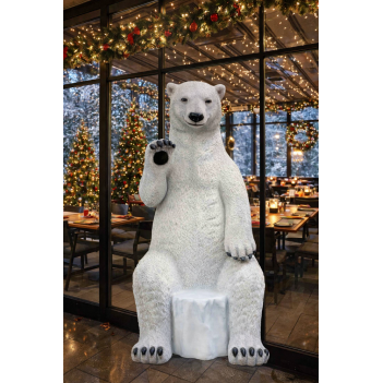 Реалистичная фигура сидящего белого медведя в натуральную величину для зимних и праздничных декораций. Размеры L 100 x W 112 x H 226 cm позволяют использовать её как декоративный элемент, фотозону или оригинальное место для сидения. Материал — прочная стекловолоконная смола, подходящая для улицы и помещений.