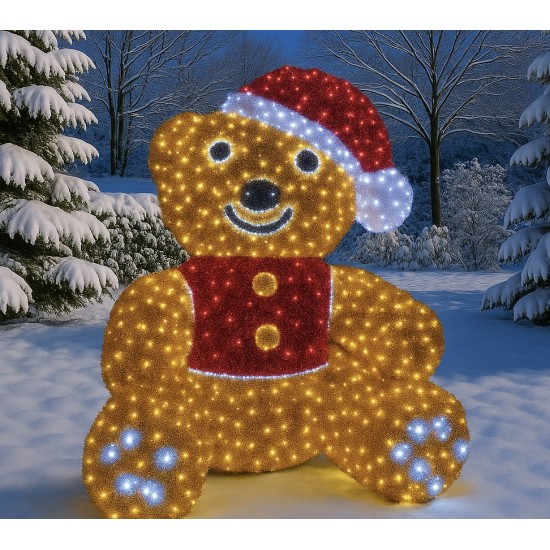 3D Animated Swaying Teddy Bear (Warm White) 3 м — крупная анимированная рождественская LED-фигура для внутреннего использования. Размеры (Product Specification): 215 × 190 × 300 см, вес 171 кг. Аниматронная сидячая конструкция, напольная установка. Освещение — LED тёплого белого цвета. Использование: только indoor. Additional Information: photo-op модель из стекловолоконной смолы и металла, серия Hamac Displays. Гарантия: по условиям производителя.