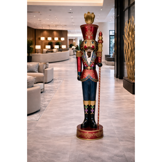 Декоративный щелкунчик идеально подходит для оформления торговых центров, отелей, ресторанов, тематических парков и праздничных мероприятий. Благодаря высоте более 2 метров он легко становится главным элементом праздничной сцены.