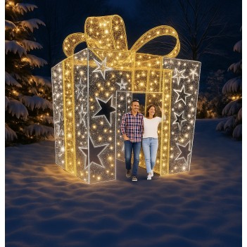 Светящаяся 3D-конструкция в форме подарочной коробки имеет размеры 320 x 320 x 400 см и весит 161 кг. Подходит для установки в помещении и на улице. Прочная конструкция устойчива к погодным условиям. Возможность пройти внутрь делает её отличным фотозоном.