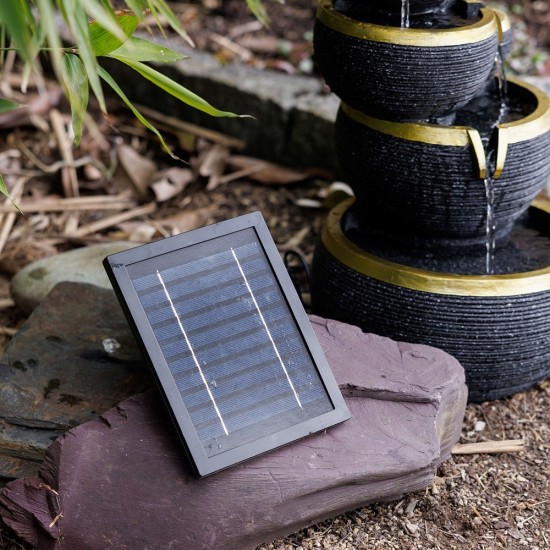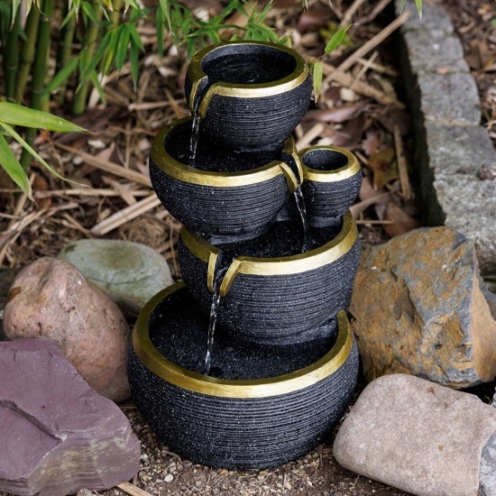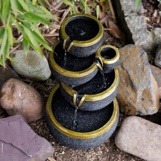 Компактный трёхъярусный фонтан с чёрной отделкой и золотыми краями подходит для сада, террасы или балкона.
