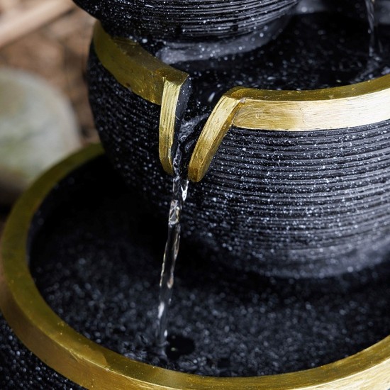 Компактный трёхъярусный фонтан с чёрной отделкой и золотыми краями подходит для сада, террасы или балкона.