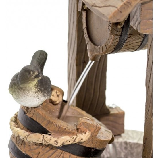Эта декоративная модель сочетает традиционный деревенский стиль с современными технологиями. Полирезин обеспечивает прочность и устойчивость к погодным условиям. Система полностью автономная – дополнительный резервуар не требуется. Установка проста: подключите насос к панели, разместите её на солнце и заполните водой. Поток воды создаёт расслабляющий звуковой эффект, идеально подходящий для сада или террасы.