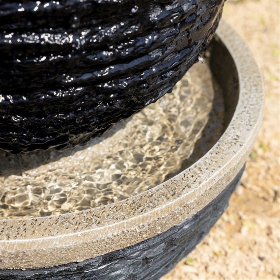 Фонтан Marvao высотой 42 см и размерами 37 × 37 см представляет собой современный садовый водный элемент для участка, террасы или балкона. Изготовлен из прочного полирезина чёрного цвета с реалистичным эффектом сланца. Встроенный резервуар и насос мощностью 7 Вт с производительностью 430 л/ч обеспечивают автономную работу. Белая LED-подсветка мягко подчёркивает поток воды в вечернее время.