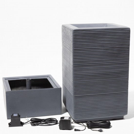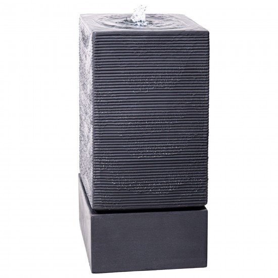 Фонтан Bari (84,5 × 39 × 39 см) выполнен из прочного полирезина серого цвета и создаёт эффект ряби благодаря продольным желобам. Встроенный резервуар и насос 22 Вт с производительностью 1100 LPH обеспечивают автономную работу от сети. Белая LED-подсветка подчёркивает движение воды вечером, делая фонтан выразительным элементом сада.