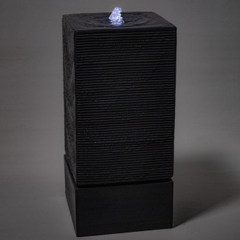 Современная геометрическая форма делает модель идеальной для ландшафтного дизайна, террас и патио. Полирезин устойчив к ультрафиолету и атмосферным воздействиям, что гарантирует долговечность и сохранение цвета. Светодиодная подсветка, расположенная у излива, создаёт мягкое белое свечение, усиливая визуальный эффект ряби воды в тёмное время суток. Полностью автономная система не требует подключения к водопроводу, что облегчает установку и эксплуатацию.