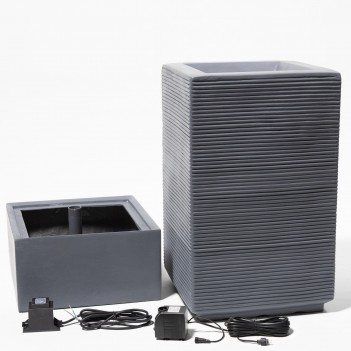 Фонтан Bari (84,5 × 39 × 39 см) выполнен из прочного полирезина серого цвета и создаёт эффект ряби благодаря продольным желобам. Встроенный резервуар и насос 22 Вт с производительностью 1100 LPH обеспечивают автономную работу от сети. Белая LED-подсветка подчёркивает движение воды вечером, делая фонтан выразительным элементом сада.